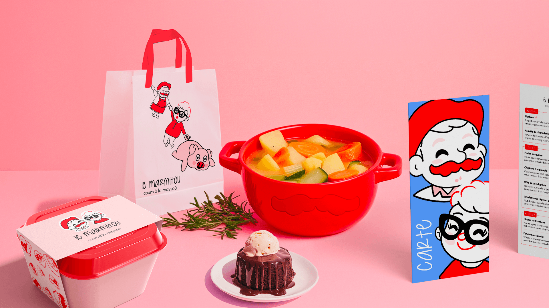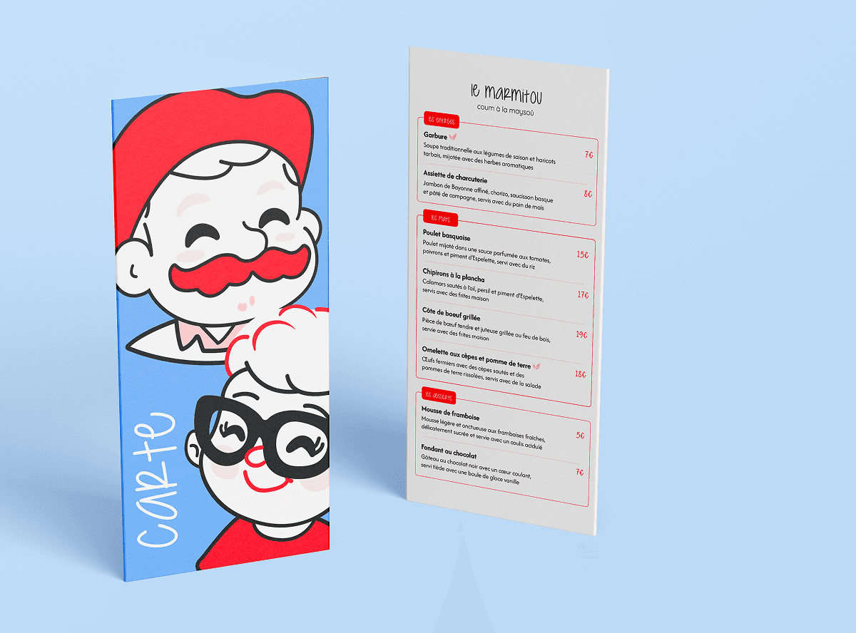 J'ai ensuite réalisé toute la charte graphique du Marmitou, que j'ai décliné sur les supports : carte, vaisselle, déco etc.