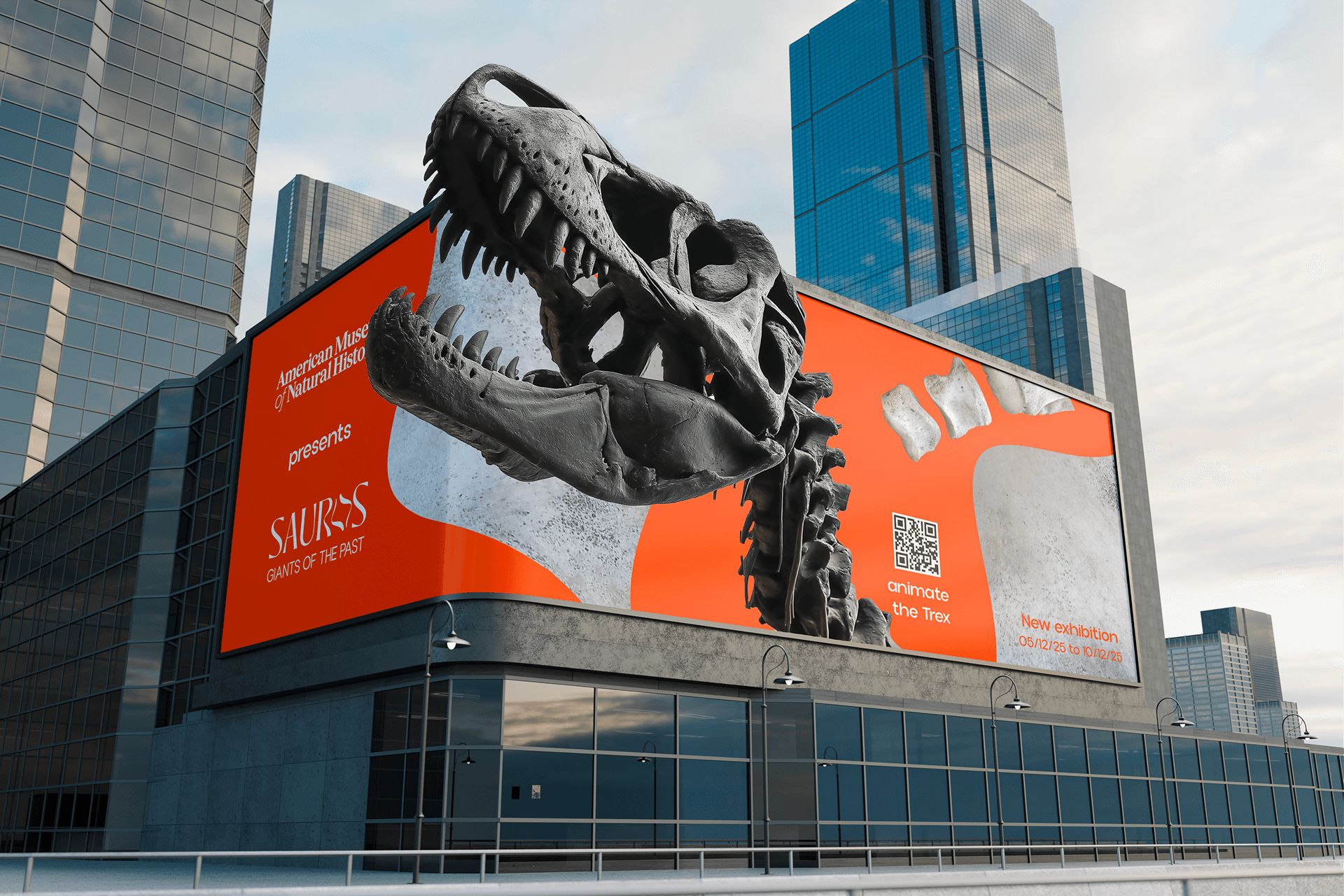J'ai utilisé des couleurs vibrantes, idéales pour capter l'attention et renvoyer une image moderne et dynamique. Je me suis aussi appuyée sur une combinaison de polices à la fois accessibles et de caractère, pour faciliter la lecture des informations. Les squelettes des dinosaures sont évidemment au coeur de la direction artistique, ils sont présents sur la majorité des éléments graphiques de la campagne.